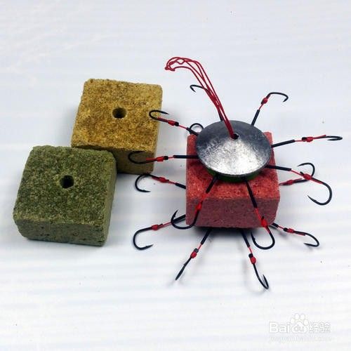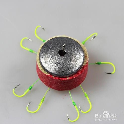 将翻板钩的绳子穿过翻板,如下图所示。翻板有不同颜色,根据对象鱼的不同而使用不同色彩的翻板,钓鲤鱼选择红色,钓草鱼选择绿色,钓综合鱼种,选择白色或是浅米色。翻板饵料的袋子上都有说明。