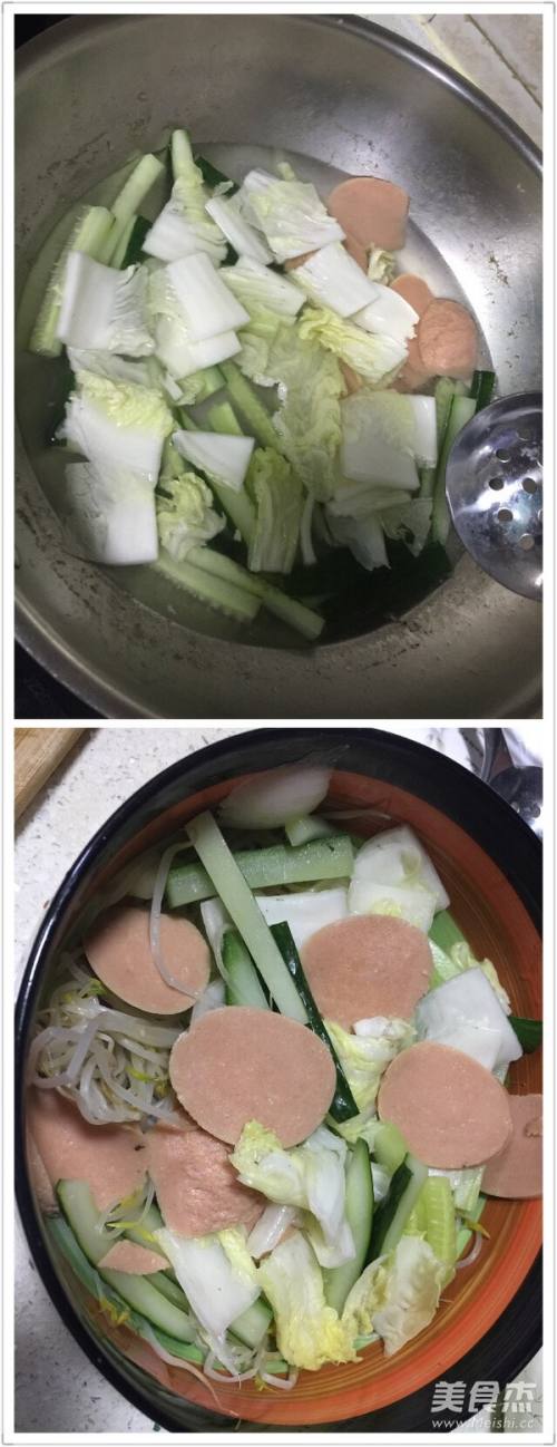 3要加进水煮鱼里的辅菜用开水灼熟,盛起来放到盘底。我喜欢把豆芽放最下面。