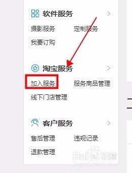 进入卖家中心页面后,这时拉动窗口向下至最下方,在左下角找到并点击“加 入服务”按钮去查看相应的服务流程与规则提示。