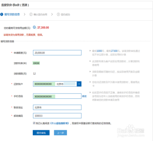 输入申请额度,等短信接收的验证码确认,进行填写,然后耐心等待审核结果。