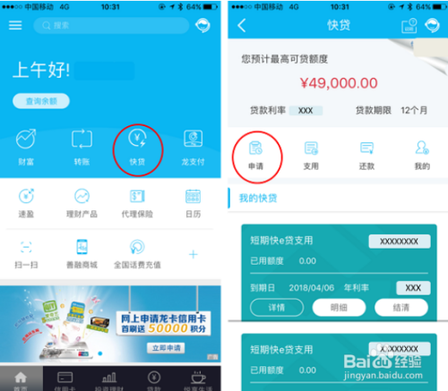 手机银行:点击【快贷】然后点击【申请】,如果已经有账户的用户直接申请,没有账户需要开通,进行相关的信息完善之后才能申请。