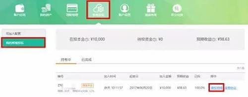 在【我的账户】—【智能投标】—【我的智能投标】查看已经加入的智能投标。(下图以30天,投资1万元为例)