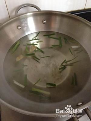 锅内放清水,水尽量多一些,下生姜块,葱段煮一下,水开后倒适量的料酒。
