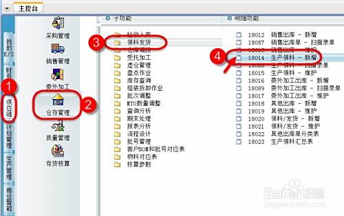 ERP操作员登录ERP主控台,依次展开【供应链】->【仓存管理】->【领料发货】->双击打开【生产领料-新增】