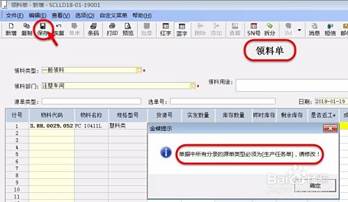 打开一张空白的生产领料单,手工选择需要领用的物料代码,数量,批号等必录项信息,最后后点击【保存】按钮,系统弹出提示信息“单据中所有分录的源单类型必须为【生产任务单】,请修改!”,单据无法被保存,说明手工编制的生产领料单无法保存。