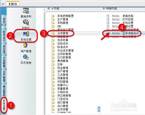 系统管理员登录ERP主控台,依次展开【系统设置】->【系统设置】->【仓存管理】->双击打开【业务流程设计】