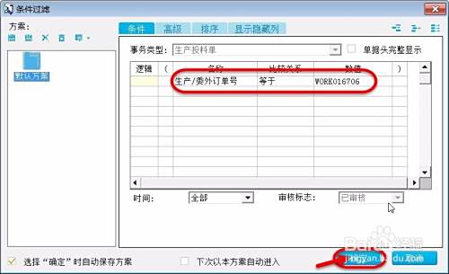 弹出过滤界面,设置相应过滤条件,此处要关联的生产任务单编号为WORK016706,点击【确定】按钮。
