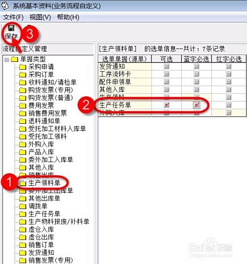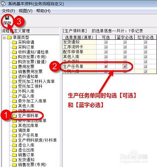 进入系统基本资料(业务流程自定义)界面,点击左侧【生产领料单】,右侧生产任务单处同时勾选【可选】和【蓝字必选】两项,最后点击工具栏【保存】按钮,完成业务流程设计工作