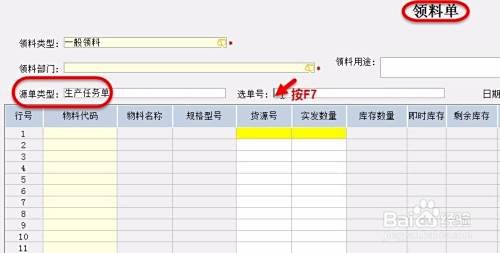 打开一张空白的生产领料单,源单类型:选择【生产任务单】,鼠标移到选单号:栏按F7键。