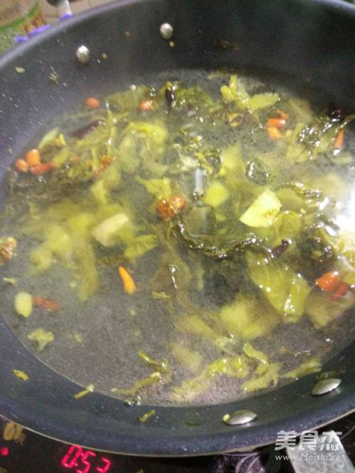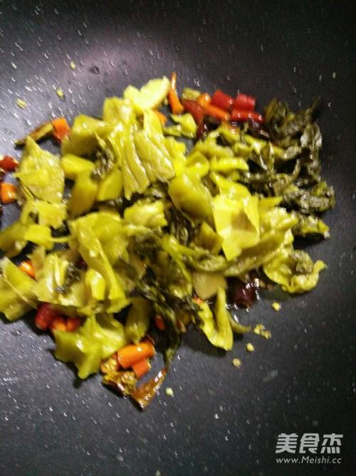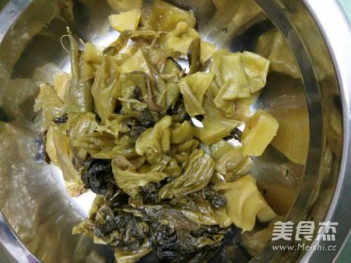 3老坛酸菜过水空干水分,切断,装碗里,备用。