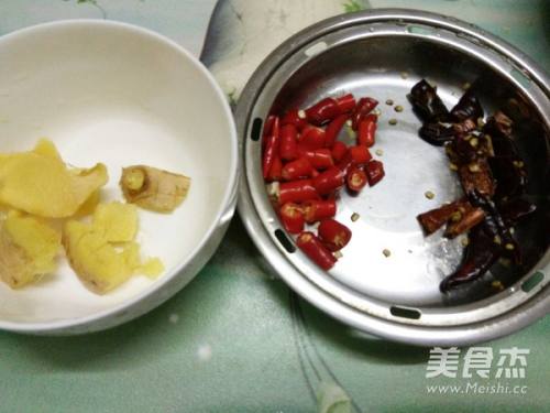 2一小片洗净的生姜拍扁切片、洗净的小米椒切小块和干红辣椒切块,分别装在碗里,备用。