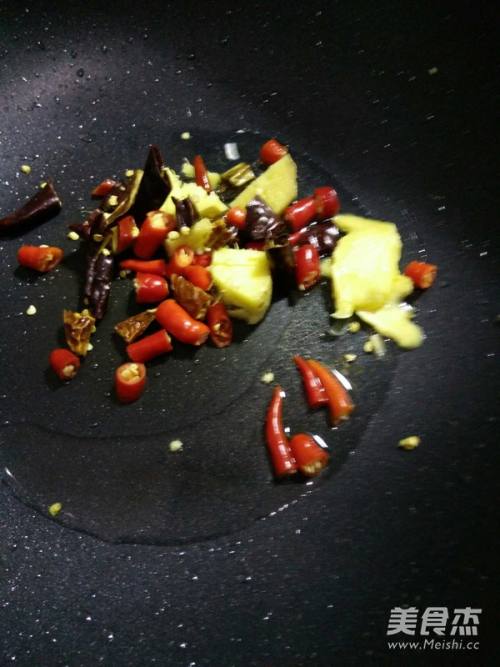 6小米椒、干红辣椒一起入锅翻炒几下。