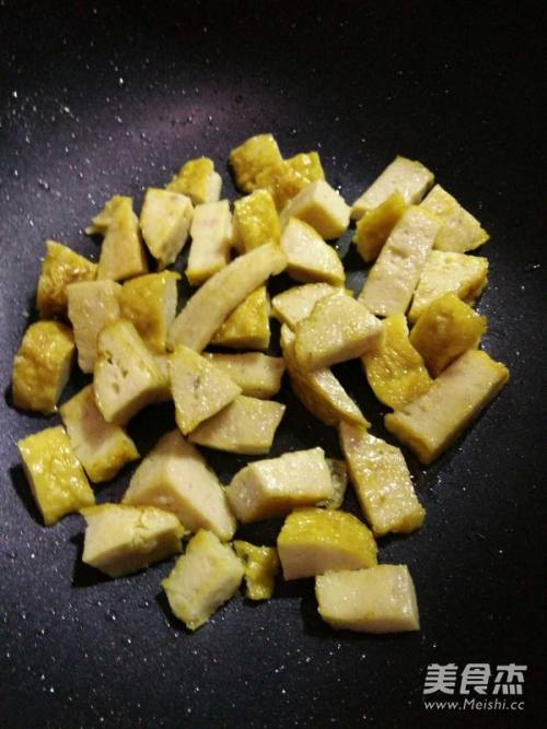 4肉卷切小块,放入加热的油锅,稍微煎一下。盛碗备用。