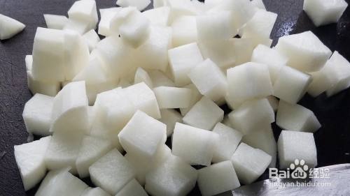 白萝卜削皮,然后也切成小丁,一样要切小一点。