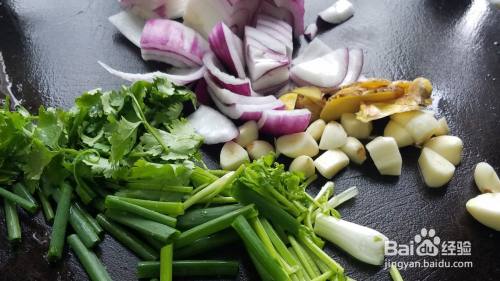 把洋葱、生姜、大蒜、青椒、香菜跟葱清洗干净后,一一切好备用,只用到小半个洋葱就可以了。