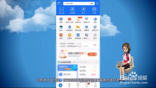 打开进入支付宝,在支付宝页面里找到商家服务点击打开。
