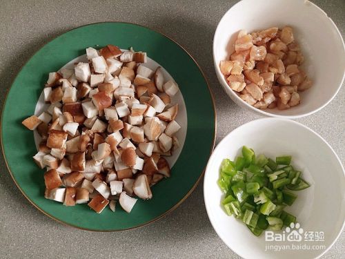 鸡胸肉切丁,加入盐、酱油拌匀,香菇、青椒切丁。