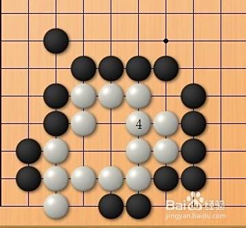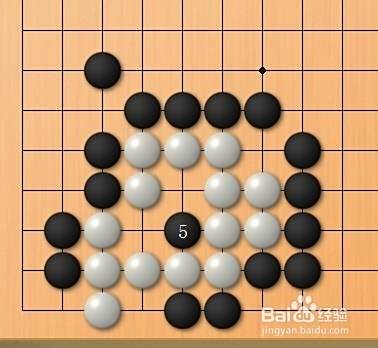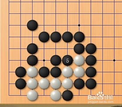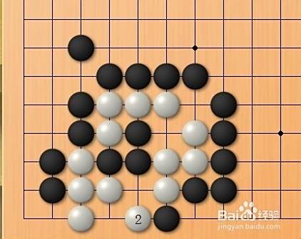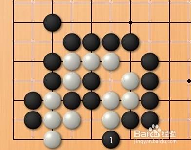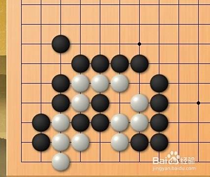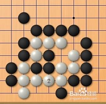 黑子这时点在拐角处,即可破坏掉白子阵势,白无法存活了。