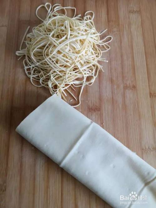 步骤二:把锅烧开水。水开。把干豆腐进行焯水一分钟。然后把干豆腐捞出放入凉水中过凉。空干水分备用。
