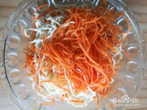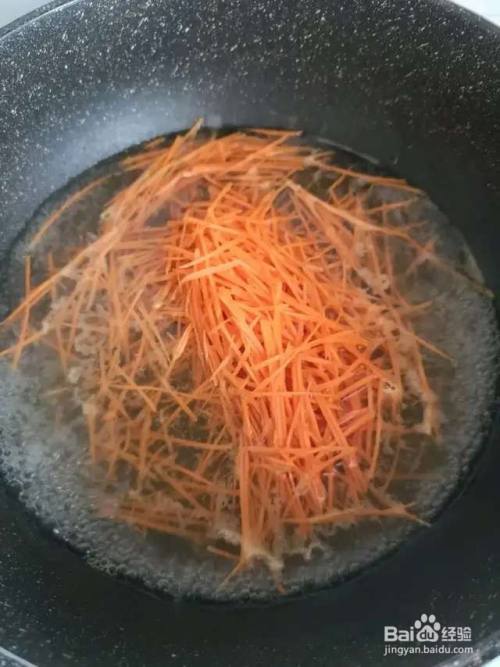 步骤三:胡萝卜切成丝儿也放入锅中也进焯一下水。捞出过凉。攥干水分备用。