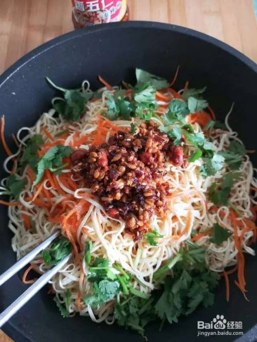 步骤五:调一个万能的料汁,放入辣椒油两勺,一勺盐,两勺香油。少许鸡精。葱末蒜末。喜欢吃香菜和醋的可以放一点。根据个人口味添加。。搅拌均匀即可。