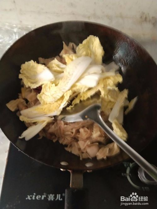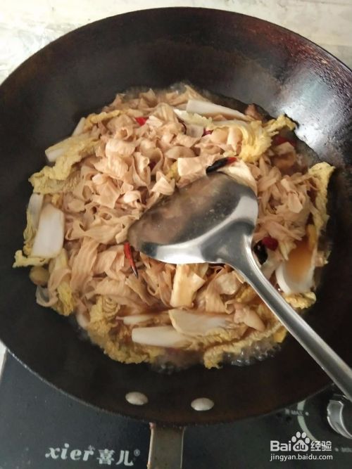 然后将准备好的青菜放入锅中,与肉丝一起进行炒制,之后再放入准备好的豆皮。
