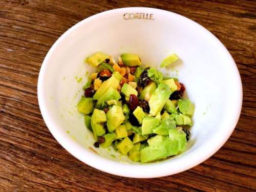 7牛油果切小块,跟黄油和干果坚果曲奇碎拌匀。