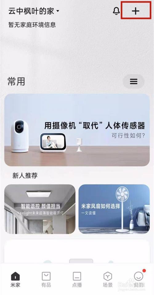 1、打开手机蓝牙后,打开米家app,点击右上角+按钮。
