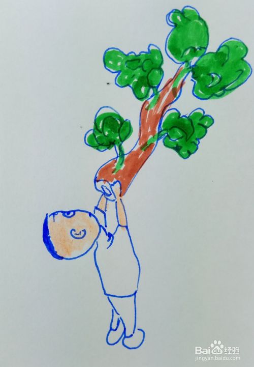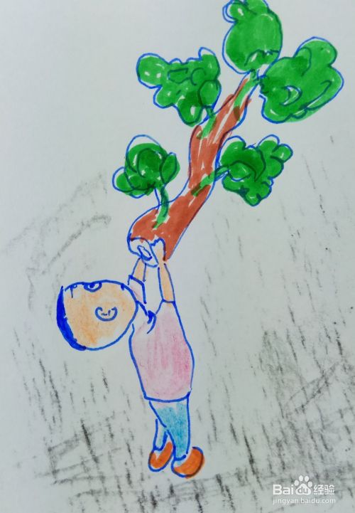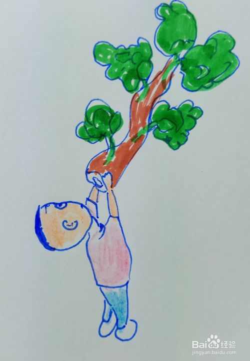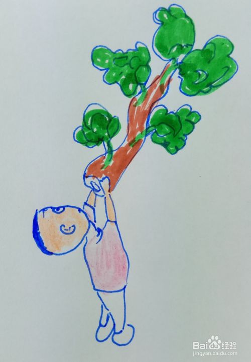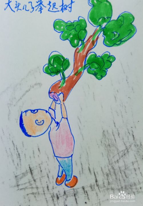 画出树的树叶部分,然后用水彩笔涂上树的色彩,在画出大头儿子的皮肤色彩。