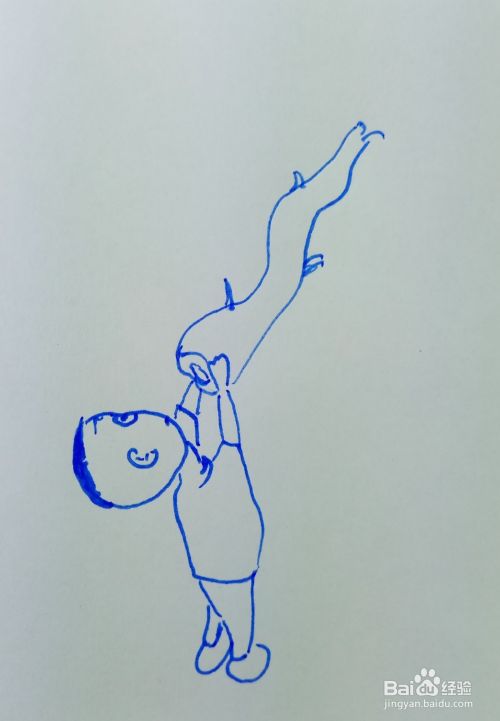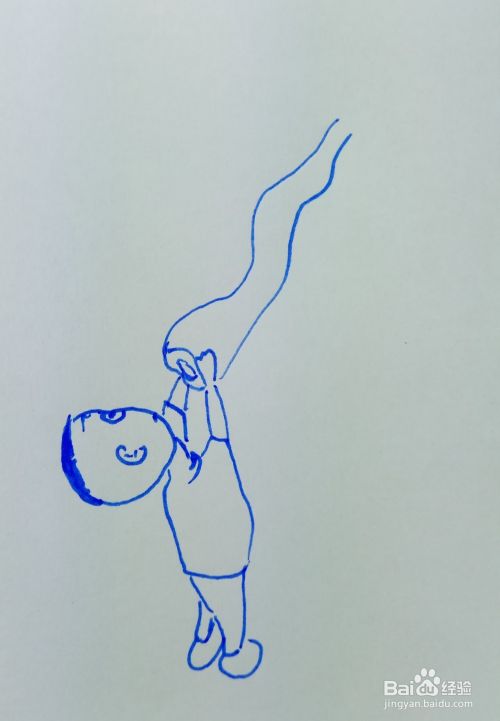 再用线条和曲线画出大头儿子的两个胳膊和他手里举起的一棵小树的树干部分。