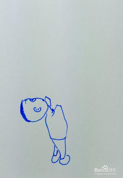 在白纸上用线条和曲线画出大头儿子的头部轮廓,并画出他的五官和头发,然后再画出他的身体部分。