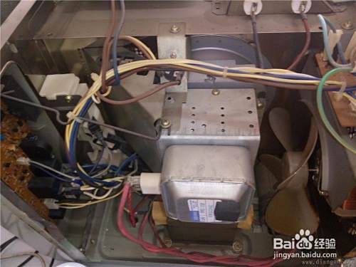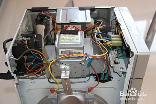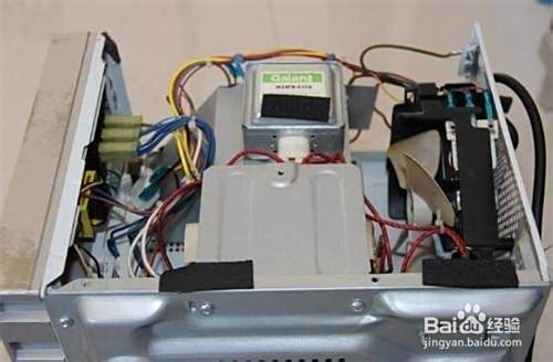 取出炉腔内玻璃转盘、转盘架等物,将微波炉翻过来让底朝上,取下中间一块盖板,再取出转盘电机。检查电机的电源接插件上有220V电压,说明电机自身有故障。用万用表测量,发现电机线圈阻值为∞,开路,正常阻值一般为10~20kΩ。更换新电机,转盘工作正常。此例是因用户把微波炉放到厨房的地方特别潮湿,并且微波炉又长期不用,而使转盘电机的线圈霉断造成电机损坏的故障。提醒用户要注意微波炉的放置环境。