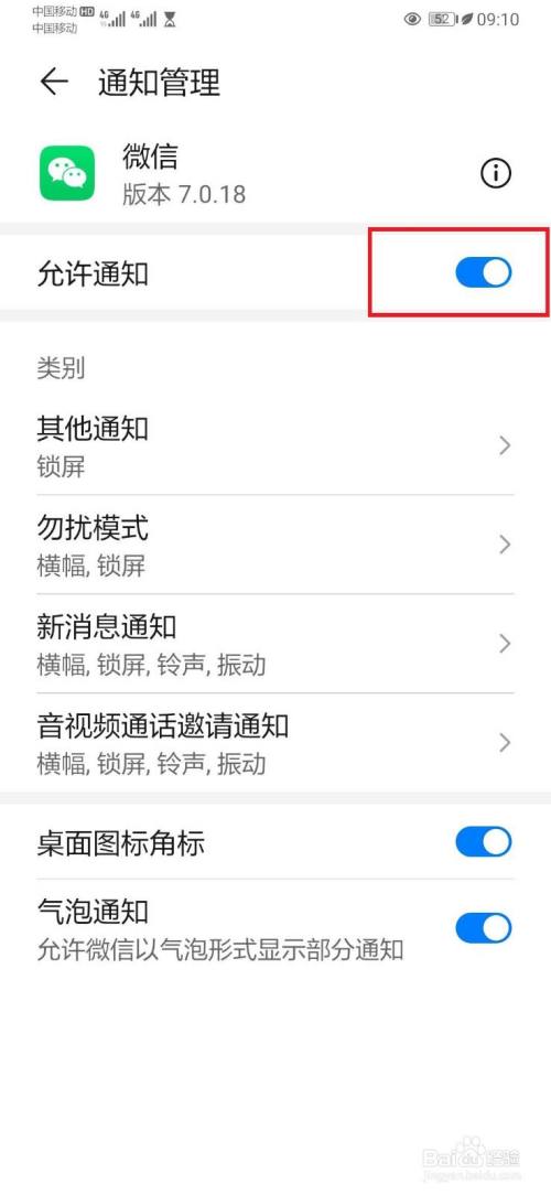 进入微信通知权限管理设置页面,点击开启【允许通知】开关,即可。如下图所示。