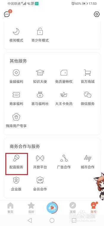 第一步打开喜马拉雅,进去我的界面,点击配音服务,如下图所示:
