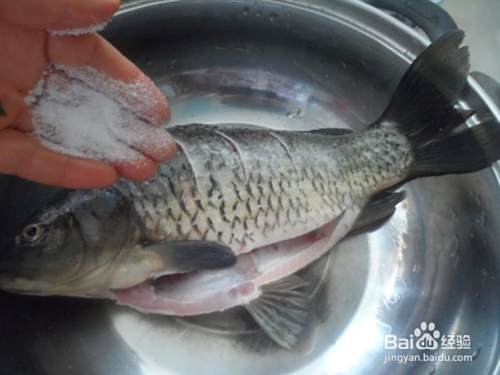 在鱼身体两侧各划几刀,撒入盐料酒腌10分钟