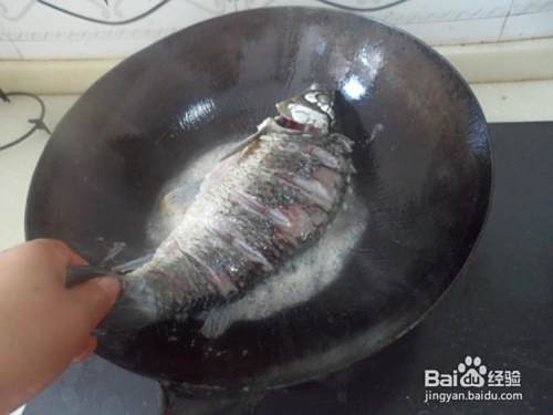 锅中加油烧热,用手拿住鱼尾,放热油中煎一下,然后反过来再煎另一面