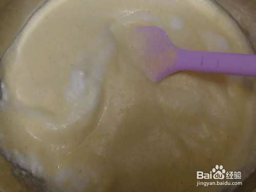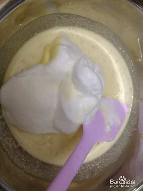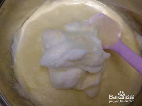用硅胶刀取三分之一的蛋白放入蛋黄糊中,翻拌均匀,像炒菜一样,从底下往上翻拌。