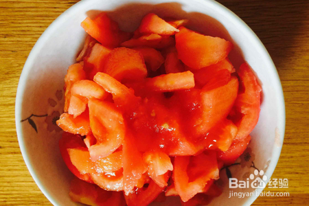 起炒锅,开火,锅热之后放入少量植物油,然后把切成小块的番茄放入,翻炒,炒出红汁。