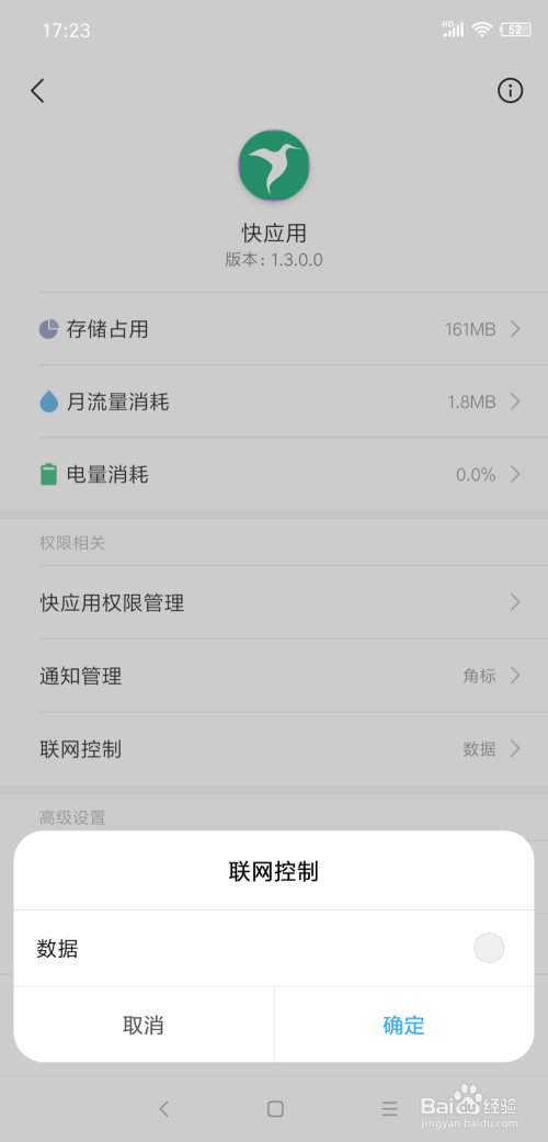 在应用管理中找到快应用,并点击进去,找到联网控制