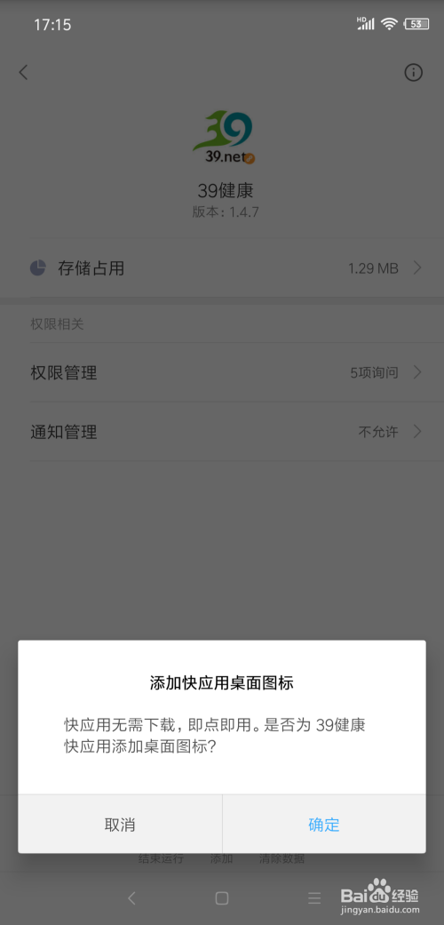 点击需要卸载的应用,进去后点击添加按钮,出现添加快应用桌面图标的提示,点击确定
