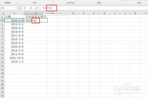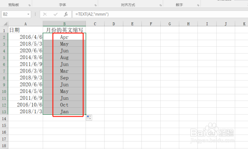 1、如下图所示,想要将A列中日期的月份,提取为英文缩写格式;
