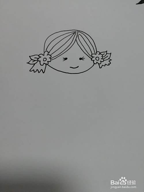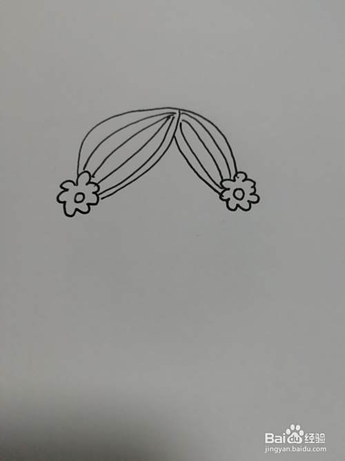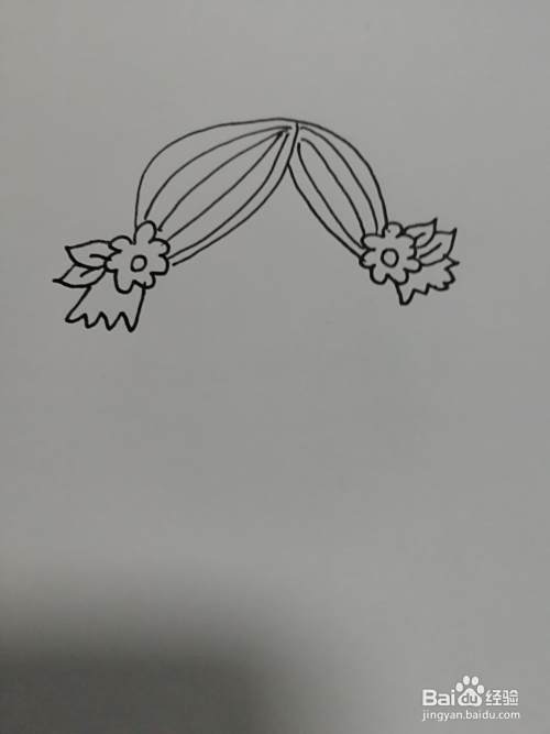 然后再两朵小花的中间画出小女孩的头发,如下图: