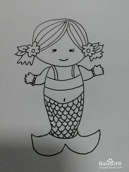 最后我们画出带着珍珠的小女孩的小手,这样一个美丽的美人鱼小女孩就画好了,如下图: