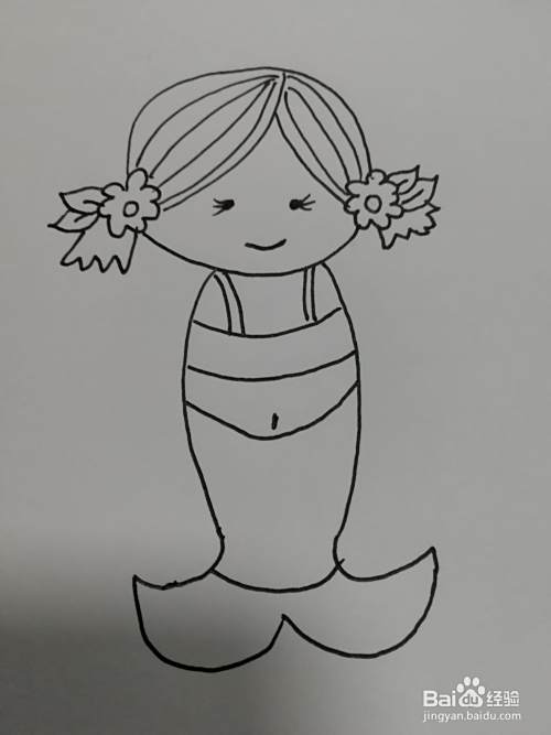 然后我们在两朵小花的旁边画上一些小叶子,再完善一下美人鱼小女孩的小辫子,如下图:
