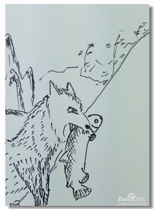 修饰一下细节,再画出远处山上的树木,钢笔画与狼捕鱼就画好了。