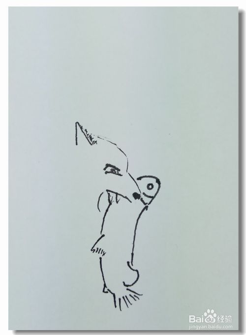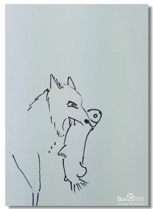 再用曲线和弧线画出狼嘴巴里叼着一条鱼,并用小点点画出的鱼眼睛。