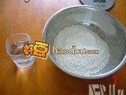 2将面粉中间挖空,分次往中间倒水,用手将水面揉均匀;