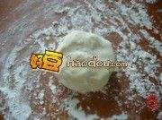 4将面团分成3段,先取其中一段,在案扳上撒上干面粉,擀成圆型的饼;