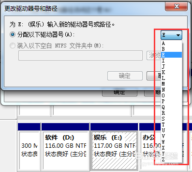 在分配一下驱动器号对过来点击小三角形展开选择一个自己需要的驱动器号再点击确定,如图所示