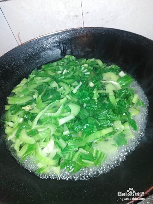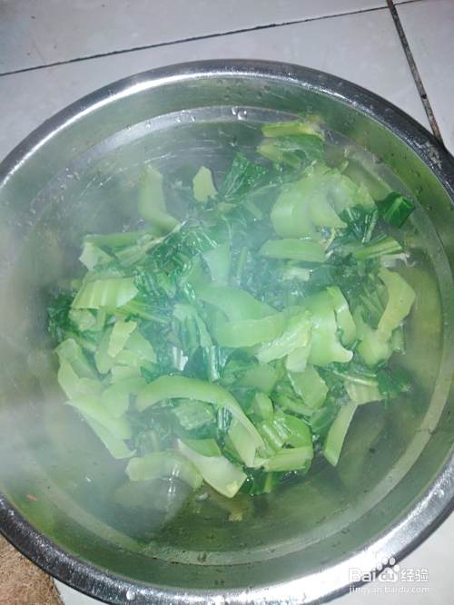 芥菜在锅里煮沸后舀入碗里沥干水备用